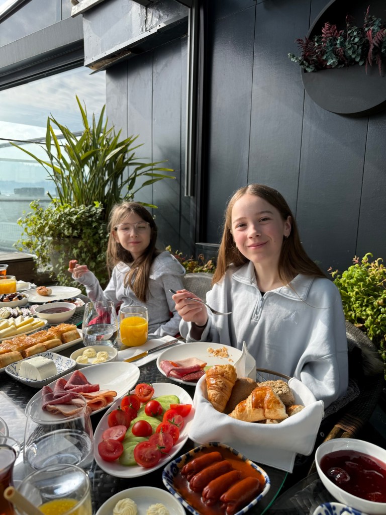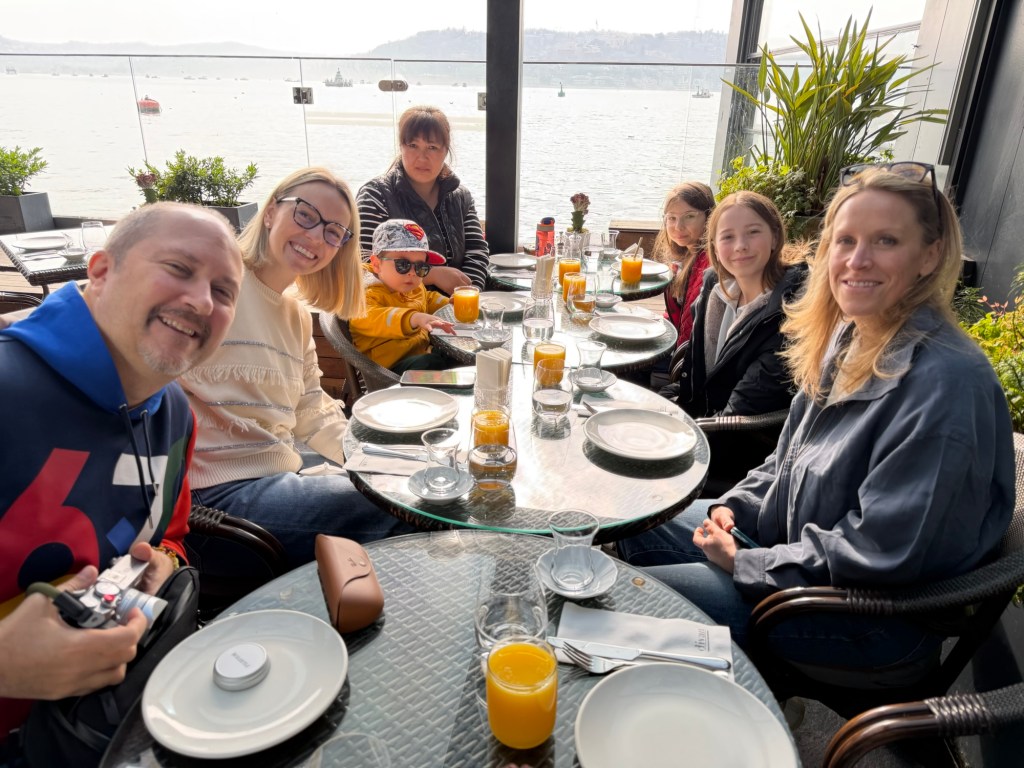 After a wonderful night’s sleep in comfy beds, rather than airplane seats, we all awoke refreshed. Today’s plan started with a drive to the Bebek area on the European side of the Bosporus. Once the cars were left in the hands of the valet (parking is quite a challenge here) we walked a short way to a wonderful riverside restaurant called Divan. It was our introduction to a full Turkish breakfast. It was astounding to see the incredible amount of food that was brought to the tables, one delicious dish after another. The breads and cheeses alone were terrific but all the other dishes were equally so. Many cups of tea later we were brought our choice of egg dishes, I don’t know what mine was called- it was a mix sort of like soft scrambled eggs with tomato and cheese. Yum! We ended the meal stuffed but managed to try a cup of Turkish coffee to finish it off. May be the only cup I consume. Dark, thick, unfiltered. Even for this coffee lover it was a bit much.