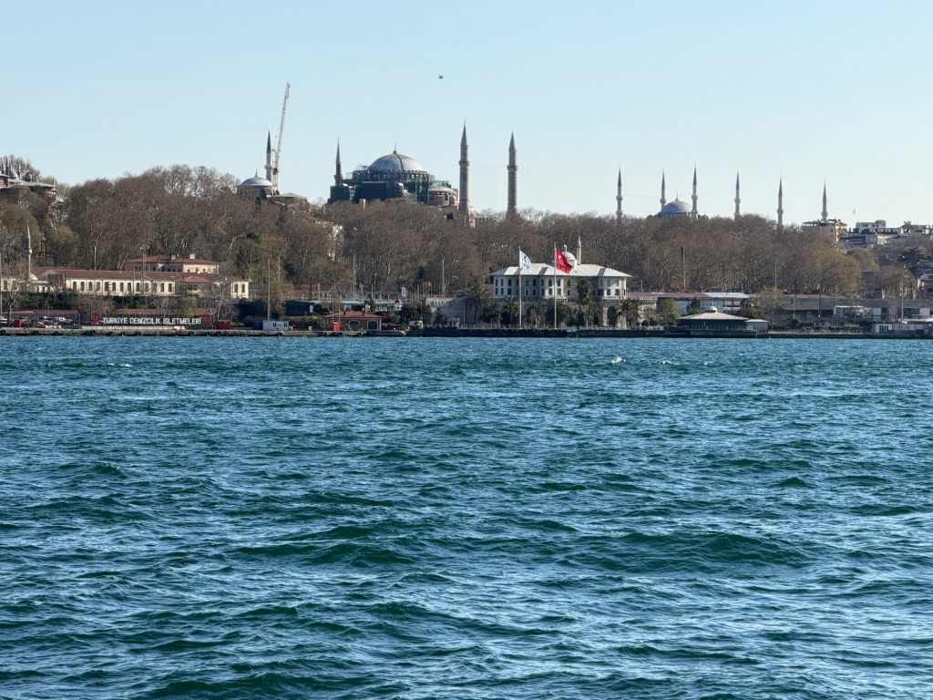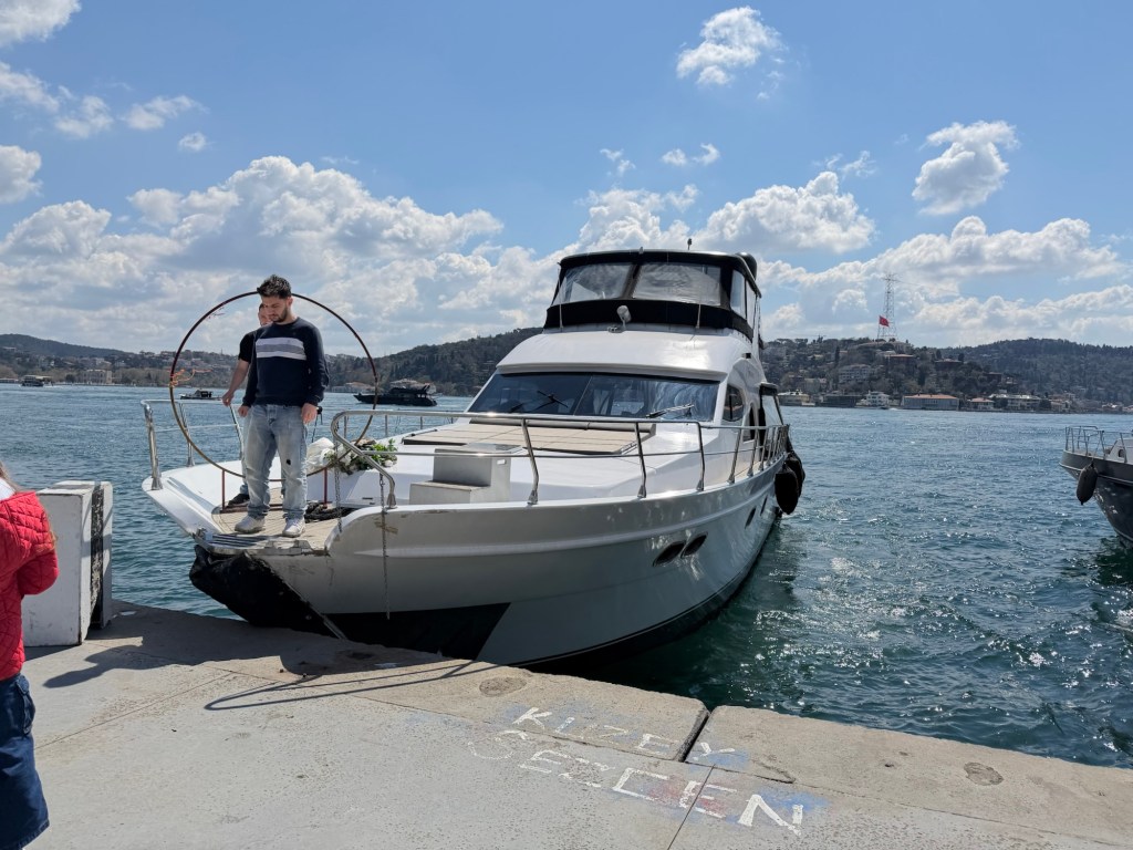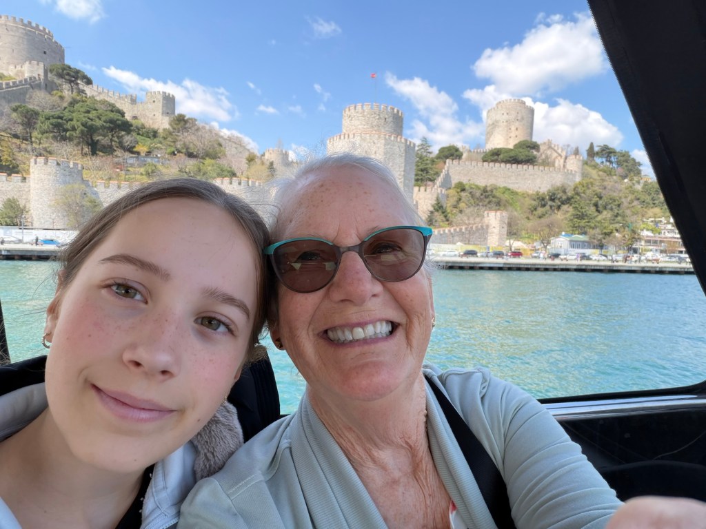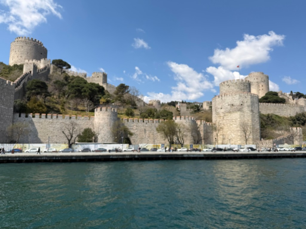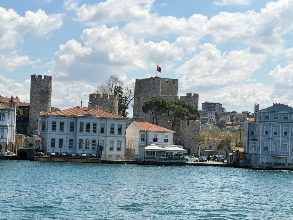 Fortunately we had a chance to walk off some of the large meal as we walked along the river heading to the next adventure. The weather was perfect for it – warm and sunny. Lots of people out enjoying the day as we headed to the boat that Gözde hired for us. We all climbed aboard, made ourselves comfortable and began a two hour sail up and back along both sides of the river. What sights! The European side had mostly apartments but also an amazing fortress, the Remeli fortress from the Ottoman era, dating to 1452. Once we crossed the river to the Asian side the waterfront had more houses along with a smaller fortress. We were able to also glimpse the palace on that hillside where our hosts were married as well as the Maiden’s tower from the Byzantine period. After a wonderful sunny, wind blown time we descended back along the quay.